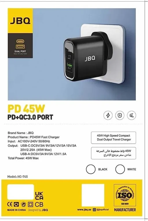 شارژر GBQ HC-745 یک گزینه حرفهای و قدرتمند برای کاربرانیست که نیاز به شارژ سریع، ایمن و چندمنظوره دارند. توان ۴۵ وات و پشتیبانی از فناوریهای PD و QC 3.0، آن را برای شارژ سریع لپتاپها، تبلتها، گوشیهای موبایل و گجتهای دیگر بسیار مناسب کرده است.