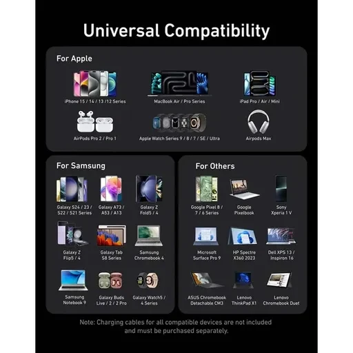 | سازگار با گوشی موبایل | لپتاپهای پرقدرت مانند MacBook Pro، Dell XPS، ThinkPad گوشیهای پرچمدار مانند iPhone 16/15 و Galaxy S24/S23 (پشتیبانی از PPS/SF Charging) تبلت، iPad، Nintendo Switch و سایر گجتهای USB-A |