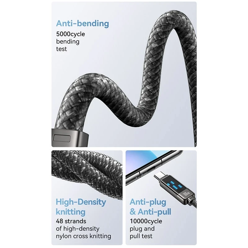 یکی از ویژگیهای متمایز این کابل، نمایشگر LED روی بدنه است که وضعیت انتقال شارژ را بهصورت لحظهای نمایش میدهد. این قابلیت علاوه بر زیبایی، تجربهی استفاده هوشمندانهتری را به کاربر ارائه میدهد.