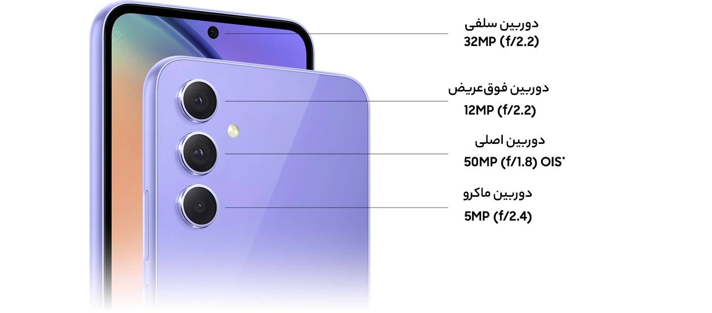گوشی Samsung Galaxy A54 5G در بخش سنسورهای دوربین با سنسور دوربین عریض (اصلی) ۵۰ مگاپیکسل و سنسور دوربین فوقعریض ۱۲ مگاپیکسل حضور قدرتمندی دارد. در نور شب، با گشودگی دریچه دیافراگم f/1.8 که جذب نور بالایی دارد، خروجی تصاویر با روشنایی بسیار خوبی را شاهد خواهید بود. همچنین، قابلیت نرمافزاری و بسیار پرکاربرد عکاسی حالت شب یا همان night mode که میزان بسیار زیادی از نویزهای موجود در نور شب را حذف میکند و در نهایت تاثیر بسیار بالایی در ارائه خروجی تصاویر با نویز کم و کیفیت بسیار خوب دارد.
